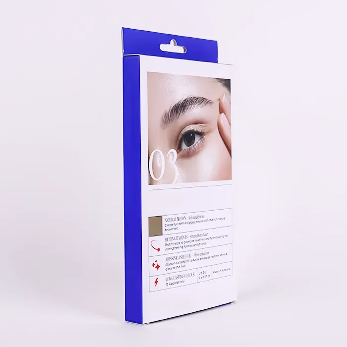 Тези отпечатани кутии Hang Tab са проектирани и произведени от Doyoupacks за пазарна марка за красота, която има силно присъствие в каналите за продажба на дребно на масовия пазар. Когато нашата фабрика първоначално проектира структурата на опаковката, обмислихме нейните сценарии за продажба и продуктът вътре е писалка за оцветяване на вежди. Персонализираните висящи кутии за търговия на дребно са най-подходящият избор, тъй като са подходящи за показване окачени на кука в търговски вериги, включително дрогерии и магазини, фокусирани върху красотата. В допълнение, стабилният капацитет на натоварване и дизайнът на отваряне с двоен край го правят идеален за опаковане на леки комплекти от много артикули, като писалки за боядисване на вежди.